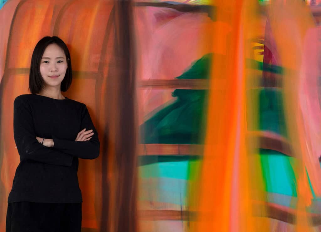 Sunyoung Hwang: “Painting feels like swimming to me. My layers of paint navigate between the opposing forces of gravity and buoyancy, moving forward, staying afloat on the surface, diving beneath, or slowly eroding into the depths. I like to watch them struggle to rise for breath, then sink, then float back up – swimming and dancing across the canvas in that liminal space. In brushstrokes that resist and absorb, you can see the body and mind merge through a repetitive, survival-driven rhythm, like waves onto the canvas.”