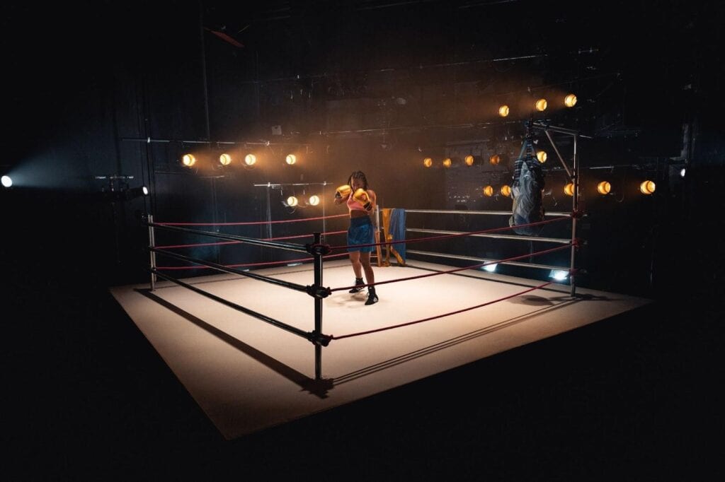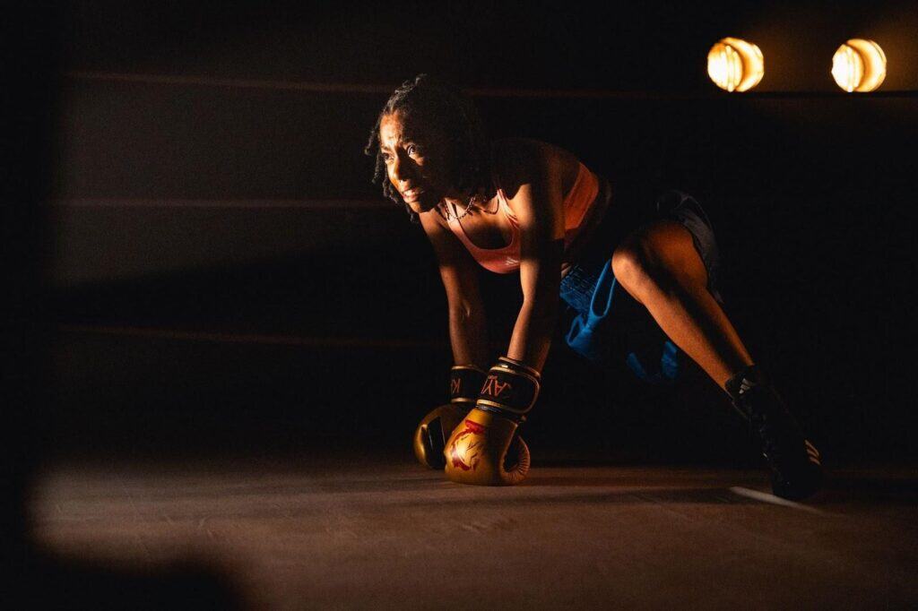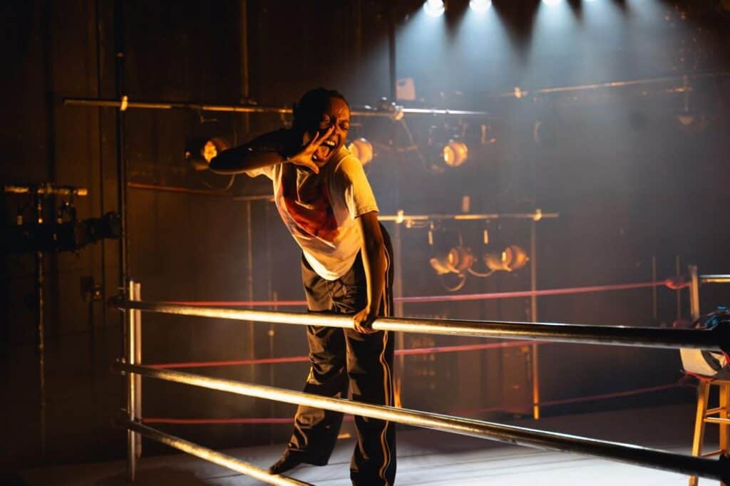 Campbell is especially impressive in the way she conjures the absent figures orbiting Chloe’s life without ever leaving the ring. With subtle shifts in voice and posture she sketches her coach Lenny, her girlfriend Jamie, and most powerfully her father. At times the lines blur, when Chloe repeats his words, it almost feels as though he’s speaking through her.