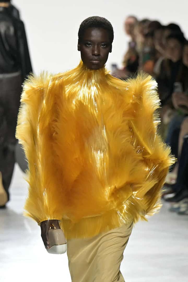 After moving with her family to Italy’s fashion capital this summer, Trotter fell in love with Bottega Veneta’s signature Intrecciato leather, a hallmark of the brand’s identity in recent years under Matthieu Blazy. We saw the technique infused into a handful of looks. Bags and two piece co-ords made up of the staple weave walked the runway. Her line-up included leathers, sharply cut double-breasted blazers with extended buttonery, gold, refined two-piece sets, and a tassel-laden, draping poncho that stretched from neck to floor. Two of such numbers were made of fibreglass strands, dazzling in gold and bronze colourways. These looks gave the collection a definitive depth and gave us a taste of what’s to come down the line at Bottega. With these pieces, Trotter seemed to signal that she has tested the waters and is not afraid to push further, setting the stage for a bold new chapter at the esteemed label. It was a collection of breadth as well as focus, a debut that demonstrated she is more than capable of carrying the house forward in her own voice.