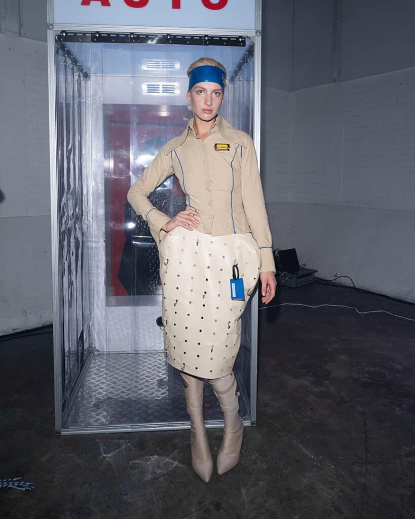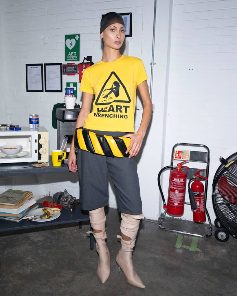Presented through Hi:Fi London, a non-profit platform supporting emerging creative talent, her latest collection unfolds inside an office in a lesbian-owned garage: a space humming with drills, microwaves, and fluorescent, if slightly flickering, light. Here, tread metal flooring, hook boards, the yellow stripes of safety paint, even mops, became her muses. Knitted grey dresses draped with cascading mop fringe brushed the floor, while warning stripes curved around hips and hems in sharp yellow and black. One look paired a T-shirt stamped “HEART WRENCHING” with a patent hazard-belt skirt. Red thigh-high boots cut through the greys. Accessories were borrowed from logistics culture; padded parcel clutches and folded-mail pouches flirted with the iconography of delivery work. But unlike Jeff Bezos’s sterile capitalist universe, this one felt human: handmade and intimate. The result was a new species of workwear, one that finds beauty in the banality of labour. “There’s nothing there that screams fashion,” she mentions. “And I see that as a challenge – to look at it through a fashion lens.”