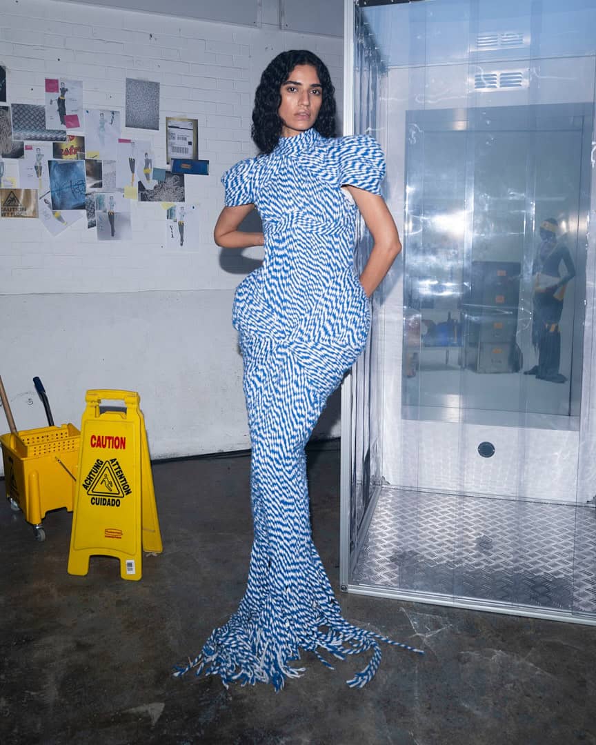 ED: It was hard, because I wanted to use mops, but where do you even buy mops from? I ended up liaising with factories and pretending I was a mop manufacturer because you could only buy premade ones, and the length was tiny. I had to contact a mop factory directly, and they sent me four huge spools, enough to make thousands of mops, it’s insane. We had it all on a roll, so we embroidered it, laying it on the fabric and hand-sewing over every bit of the white to build texture. Now I’m stuck with loads of mops, and the factory keeps messaging me like, “We’ve got new colours!” It was surprisingly cool though, they had so many colourways and mixtures. The blue-and-white one, when layered, almost looked like it was moving, creating an optical illusion that tied into the theme of motion and hazards. I think the mop dress is actually my favourite look.