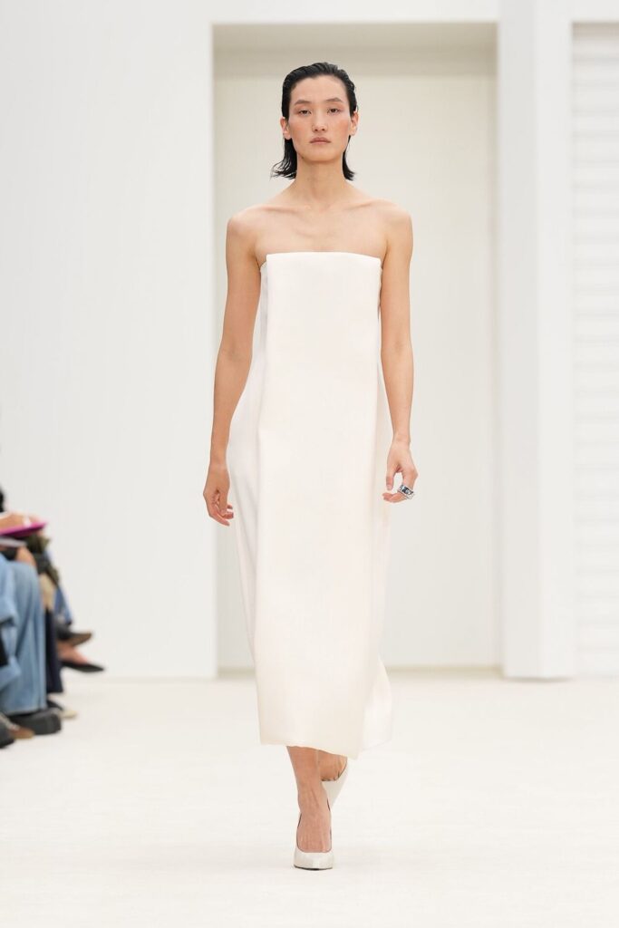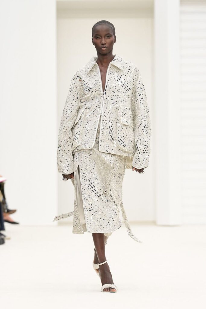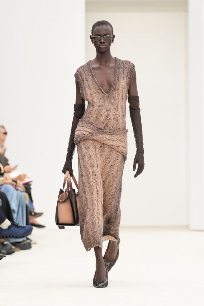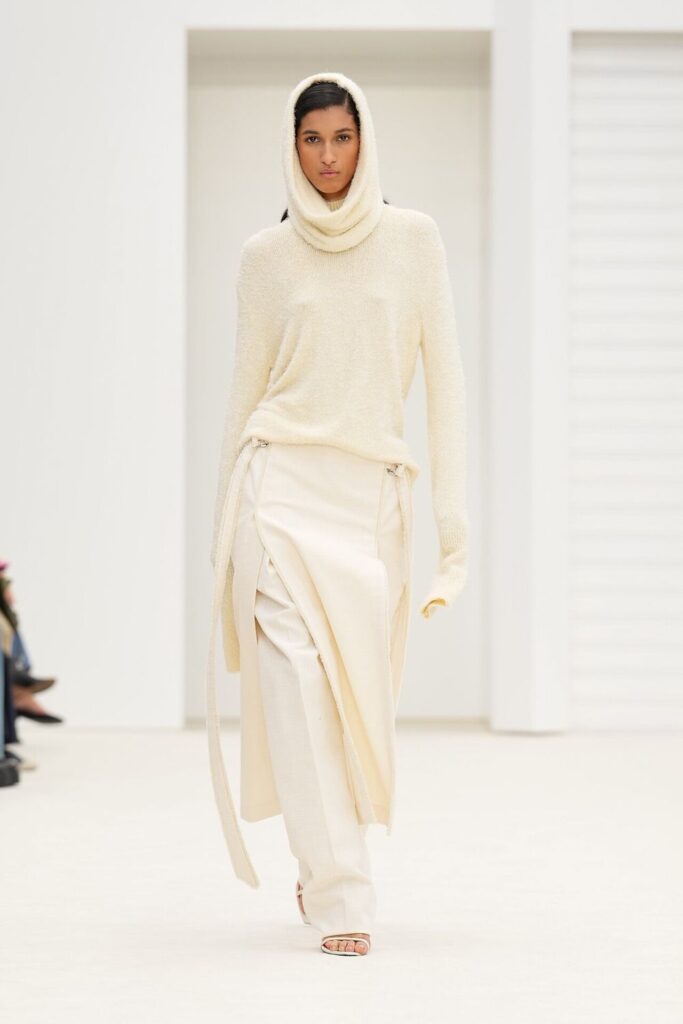 The show opened in shades of white – ivory, butter, optical, chosen not for symbolism but because they reflected the untreated tones of the fabrics themselves. Loose tailoring, long shirts, and raw-edged dresses highlighted natural yarns and emphasised construction over ornamentation. Mesh knits, soft cargo trousers, and delicate fabrics created a sense of lightness, perfect for transitional wear.