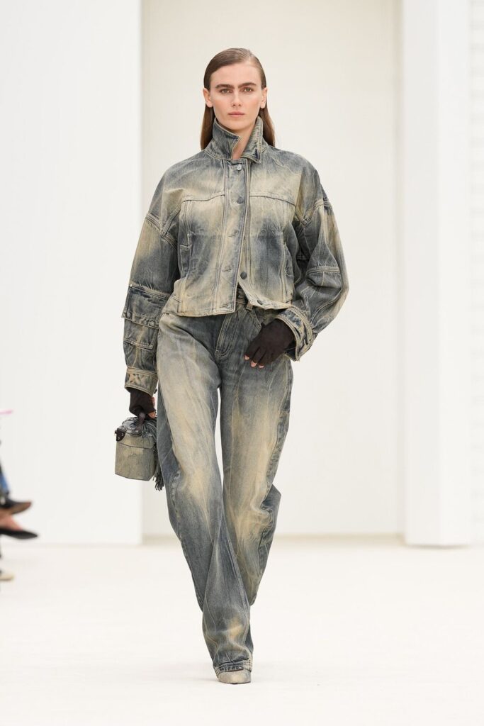 As the lineup advanced, Iannone deepened the palette with cocoa, rust, and magma red. Treatments were where the real innovation appeared: sponged leathers that felt simultaneously rugged and refined, acid-washed denim tailored into skirts and utility pants. Lannone played with dualities, setting structured bombers against languid leather dresses and reimagining suits with lapel-free cuts that highlighted fluidity over tradition.