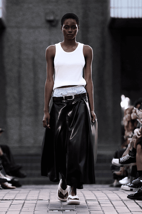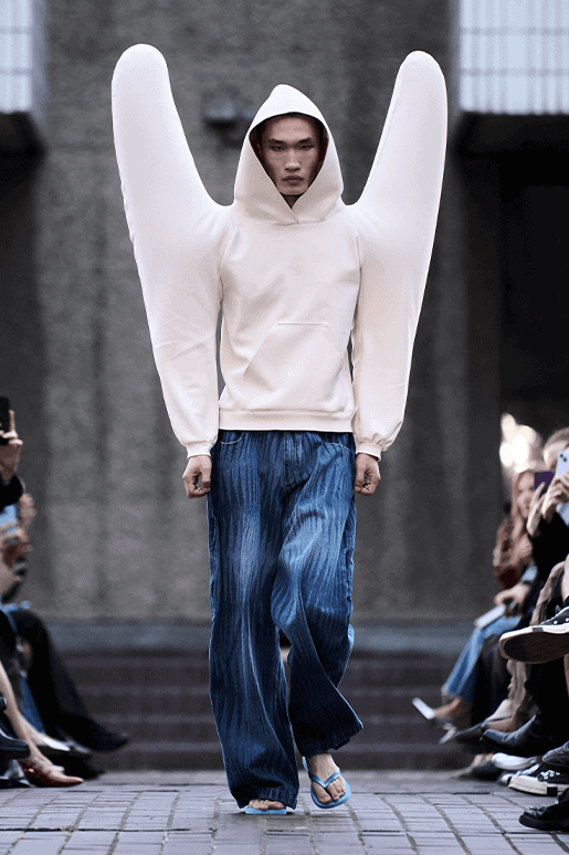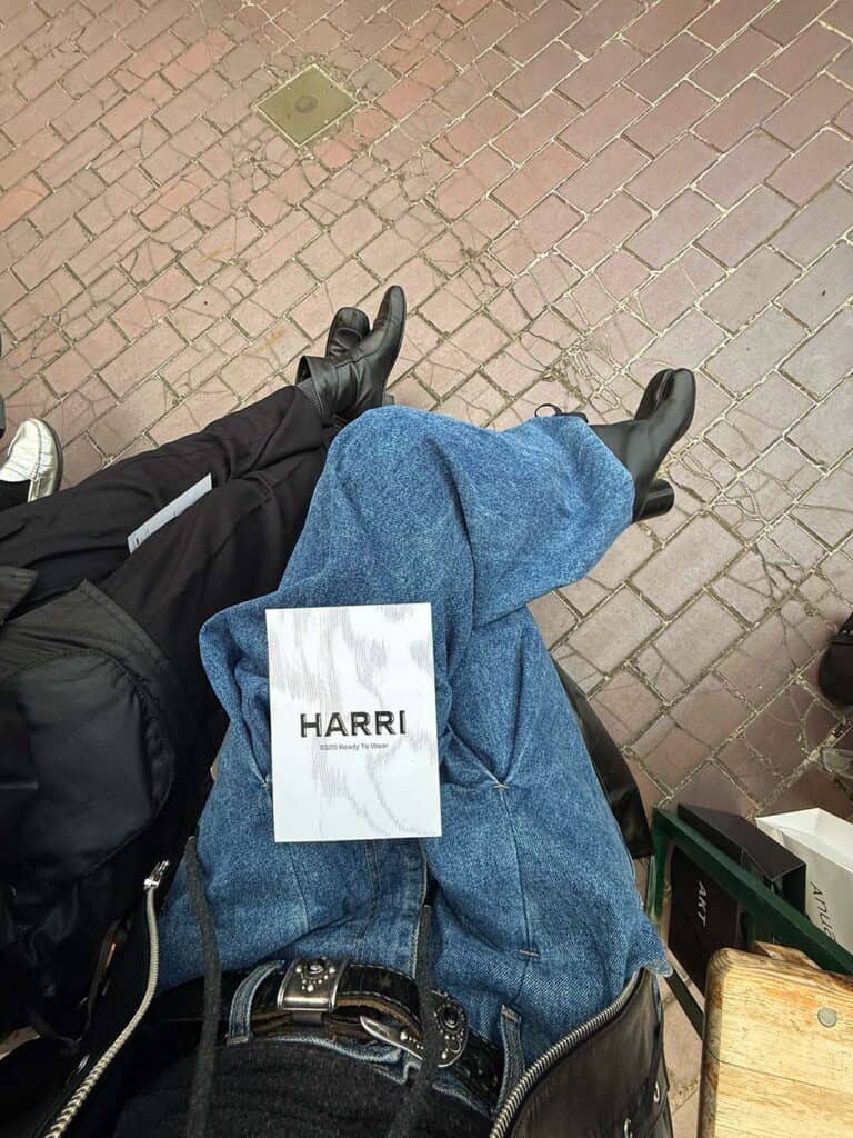Inflatable shoulder tops, a HARRI signature, appeared in both black and white, a subtle reminder of the designer’s ballooned beginnings. Even the most street-friendly pieces held a sly architectural twist – a seam that curved like a cornice, a gleam that read like sculpture, a piece of geometrically printed denim that flickered between light and darkness.