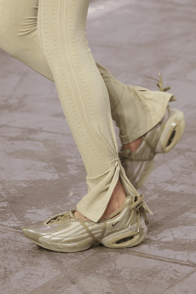 After eight years showing in London, the British fashion brand KNWLS made the choice to show in Milan, marking their commitment to expanding into new communities and showing off their latest collaboration with Nike, Synergy. Over the past few years, sports has seamlessly woven itself into fashion, transforming from functional performance wear into a cultural force that defines style, identity, and luxury. When high fashion began borrowing athletic silhouettes, fabrics, and styles, it showed that sportswear could be aspirational on and off the field. As such prominent parts of society, it’s no wonder the two have finally found common ground. KNWLS’ latest collection reimagined the role of sports in women’s lives, creating a world where the two can coexist to create an untouchable force.