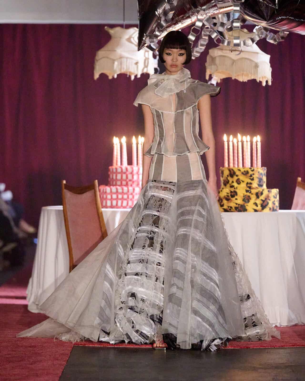 The Unlocked warehouse in Shoreditch was set like a strange domestic theatre. Parlour jazz threaded the air in crackling phrases, echoing gramophones and faded ballrooms. At the centre of the runway, a table bore two double-layered birthday cakes, candles unlit, as if waiting for a guest who never arrived. Above, tasselled pendant lamps swayed gently beside oversized silver balloons, their surfaces catching light as mist shimmered through the rafters. Plush blush carpets softened the floor, and an older couple, part of the staging, would occasionally rise to waltz, briefly collapsing the distance between performance and memory. The whole mise-en-scène read like a celebration half-recalled, equal parts intimate and uncanny, an atmosphere at once tender and off-kilter.