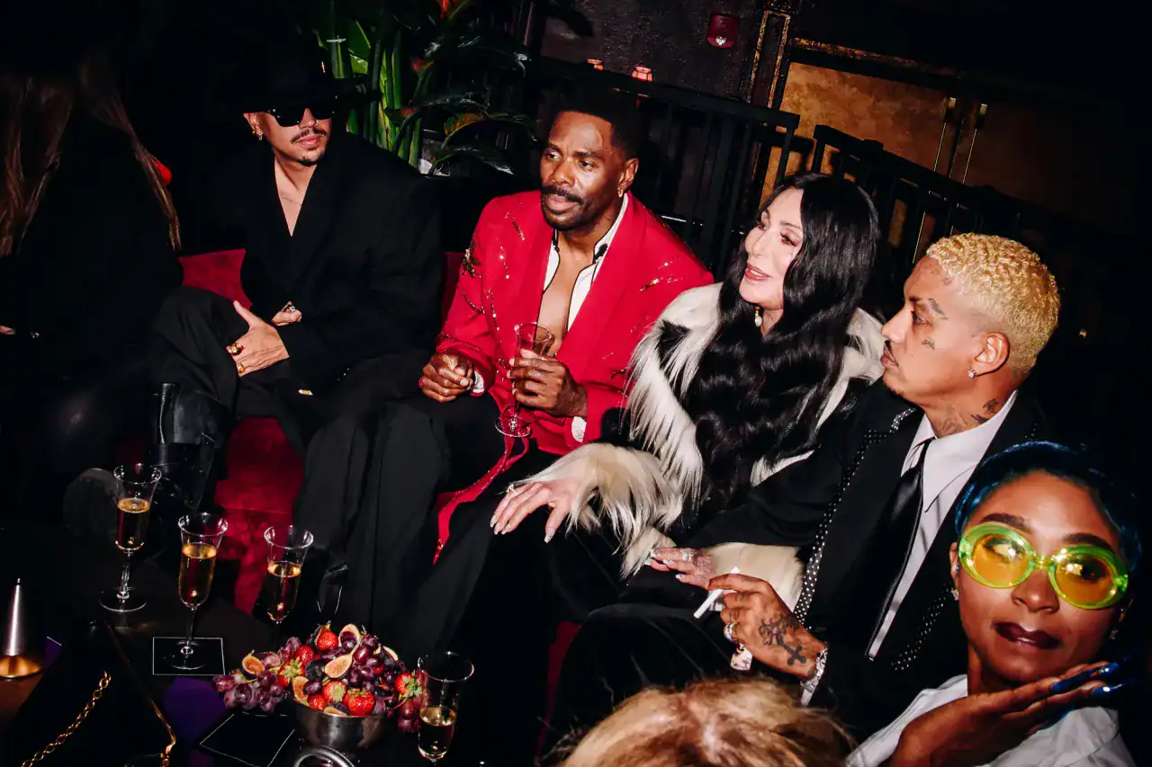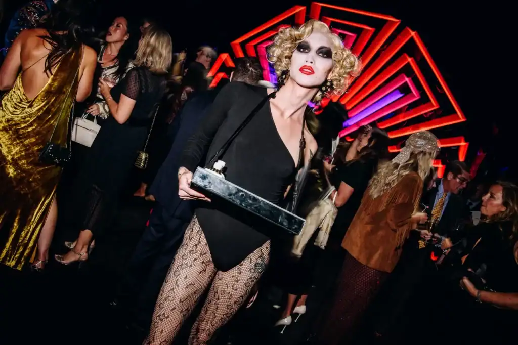Fashion’s cool kids showed up and showed out. In true ‘70s fashion, stars came in fur coats, big, bouncy blowouts and leopard print. Always on theme, Coleman Domingo got the party started in a dapper red Valentino blazer, blending in perfectly with the smoky aroma and velvet curtains. Candy cigarettes were passed around on silver trays as guests danced to Diana Ross and Donna Summers in the dimly lit atmosphere of the exclusive club. Notable looks included a leopard print catsuit–proving that leopard print will never go out of style–Cher in a Cruella Deville fur coat, CT Hedden in a pinstripe blazer with safety pin and corset detailing, Laurie Lynn Stark draped in a playful pink, feather boa, metallic faces and masquerade masks, and the return of the top hat.