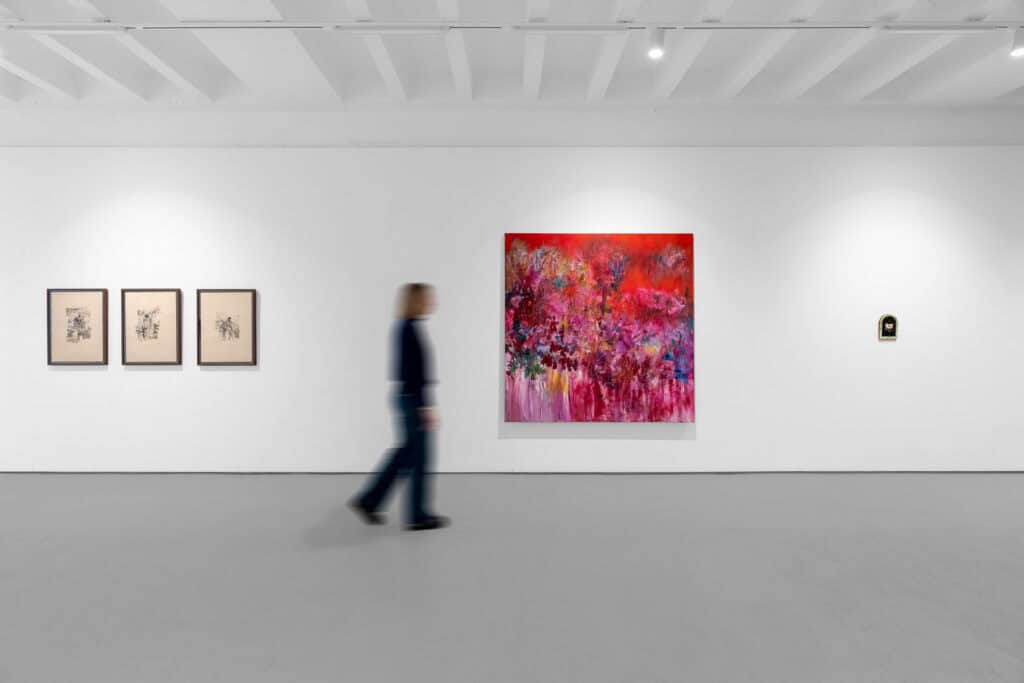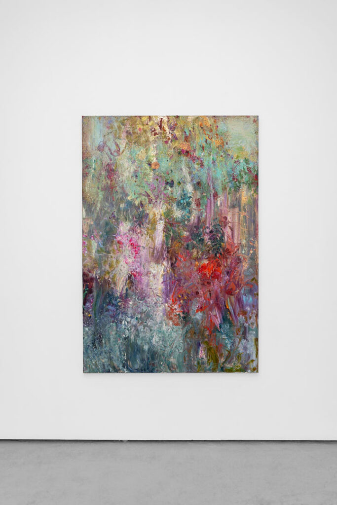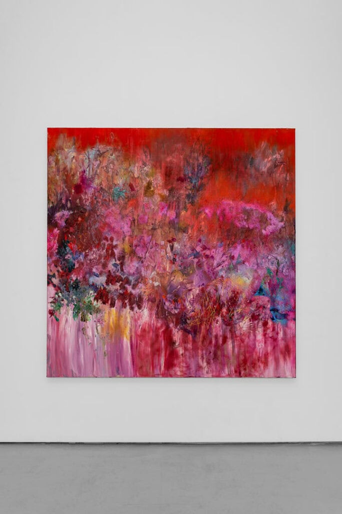 For Coming Up Roses at London’s Berntson Bhattacharjee gallery, Hao joins artists Preslav Kostov, Jemima Murphy, James Shaw and Xu Yang in a group exhibition exploring memory, emergence, and renewal. Here, her brushwork pulses with a rhythm and liquidity that reveals traces of wounds beneath layers of colour. In Uncanny Valley (2025), a large square canvas dominated by feverish reds, scattered blues, greens, and yellows, she evokes a body in metamorphosis, wounded and luminous. In Improvisational Dance (2025), Hao draws in cooler tones – this time punctuated by bursts of warmth spilling out from the bottom right. Across both paintings, lush surfaces conceal violence, and tenderness becomes visible only in the ruptures of colour that break through her brushstrokes – in the brief moments where the canvas melts away.